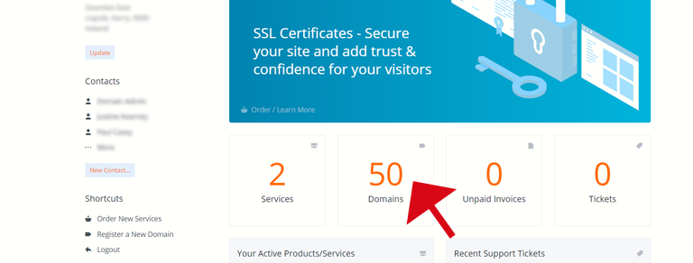 In the Homepage overview area, you'll see the link with the number of domains in your account, click on it to see a list of all your domains. (fig 1)