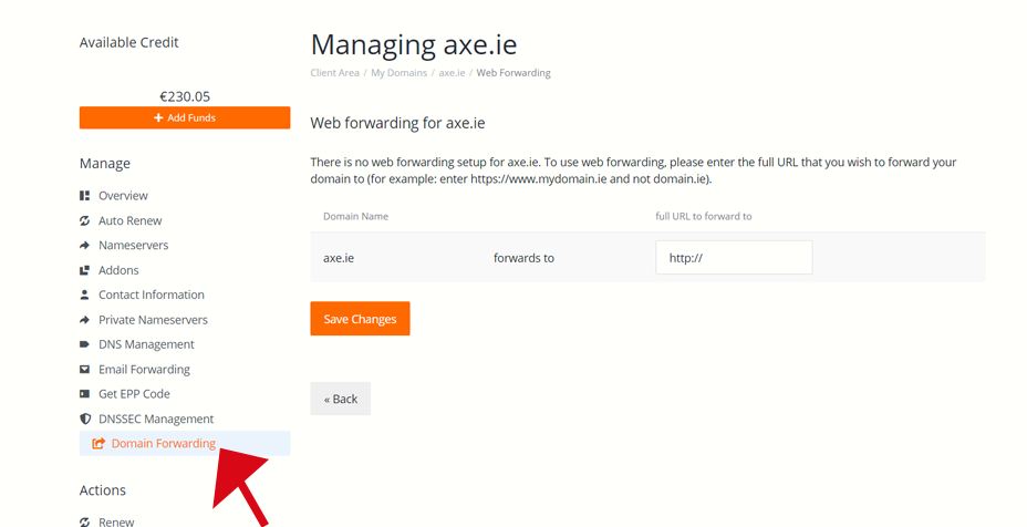 On the left-hand menu, click 'Domain Forwarding' and enter the URL where you wish your domain to redirect to. (Fig 3)
